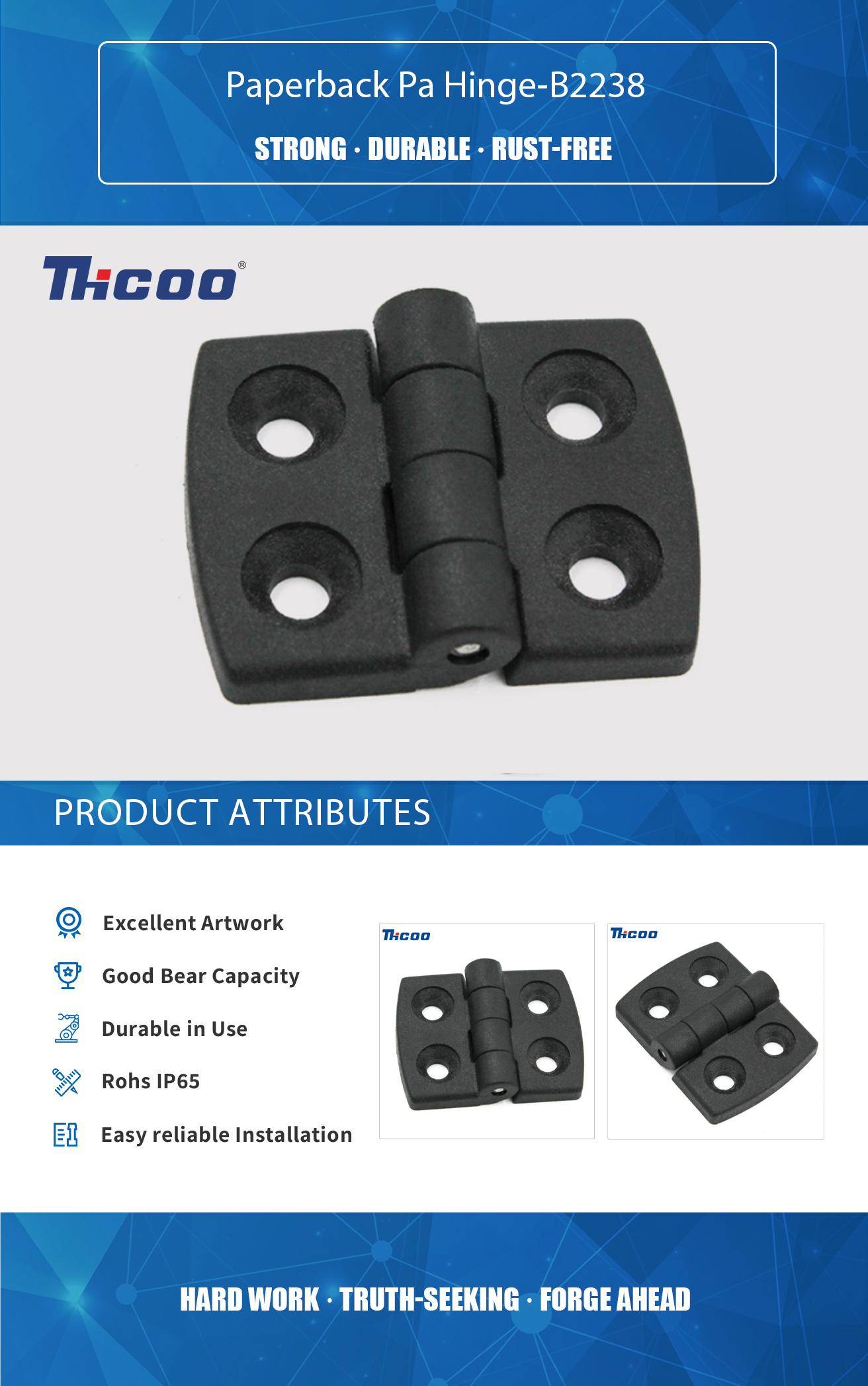Nostram habemus probationem labrum et apparatum inspicientem provectum ac perfectum, quod efficere potest ut productorum qualitas possit. Paperback Pa Hinge-B2238 genus cardo est quod ex materia nigra pulla conficitur et librum apertum ad determinatum angulum tenere solet. Cardo Hardcover typice factae ex materia flexibili, ut metallo plastico vel tenui, et ordinantur tam leves quam durabiles.